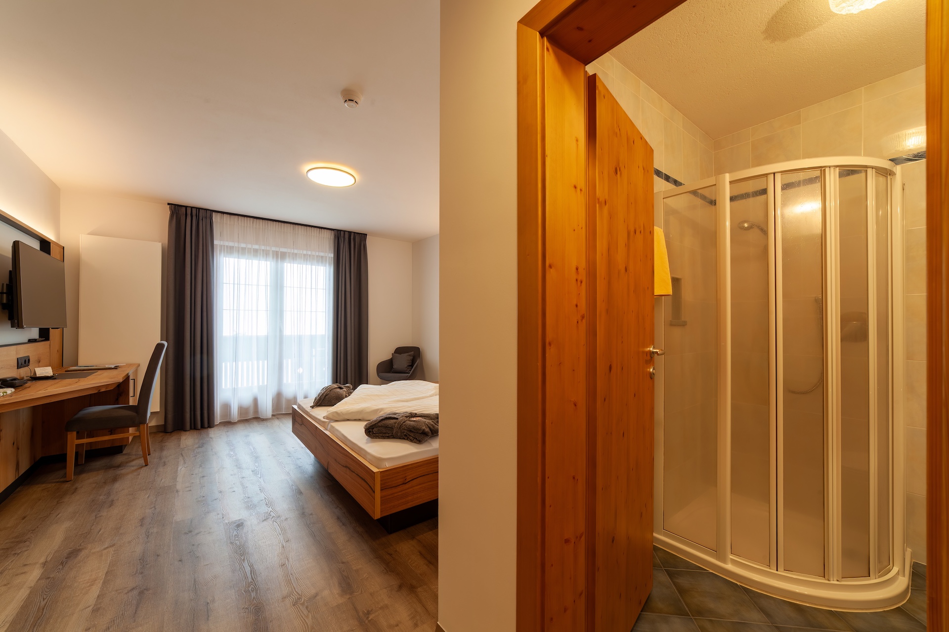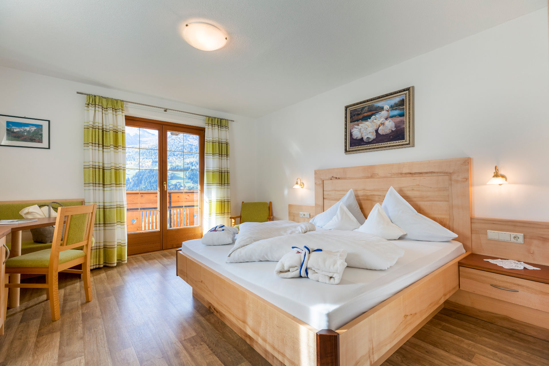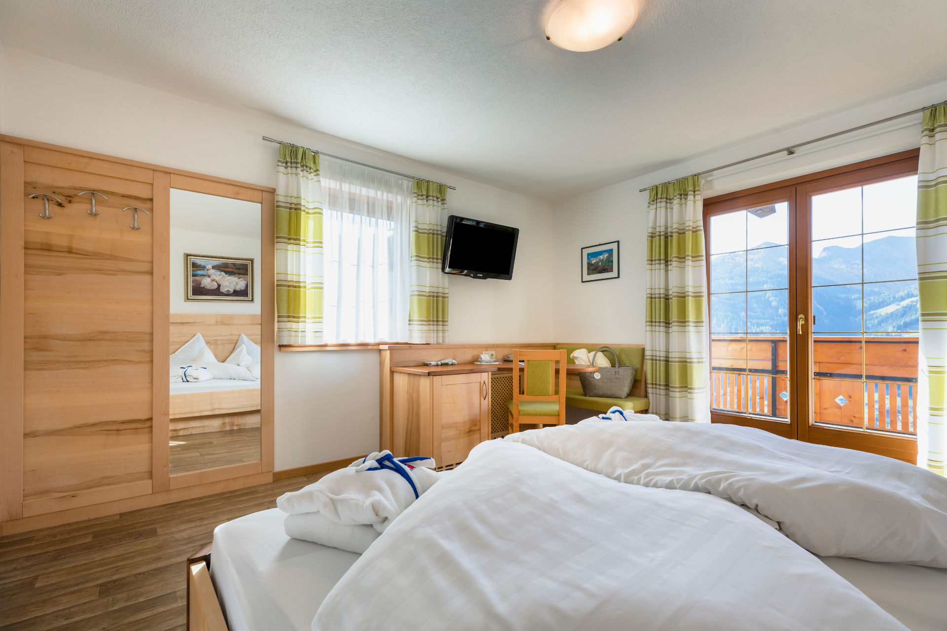 Unsere gemütlichen Doppelzimmer verfügen über einen großen Balkon mit Ausblick auf die Passeirer Bergwelt. Alle Zimmer bieten ein geräumiges Badezimmer mit Dusche & WC.